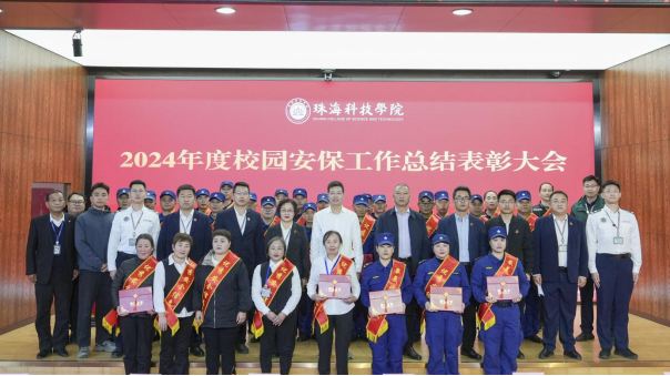 为树立典型,弘扬先进,进一步提升学校安全管理水平,2025年1月12日下午,学校在明德楼报告厅举行2024年度校园安保工作总结表彰大会,学校党委委员、纪委书记、副校长黄学寿,珠海安保集团有限公司金湾分公司总经理肖竞海,学生处处长高英杰,后勤处处长赵明静,保卫处处长朱永康,校团委副书记陈殿藩,保卫处副处长薛嘉升、保卫处全体工作人员以及校卫队、维保单位部分代表参加会议,保卫处副处长沈方龙主持会议。