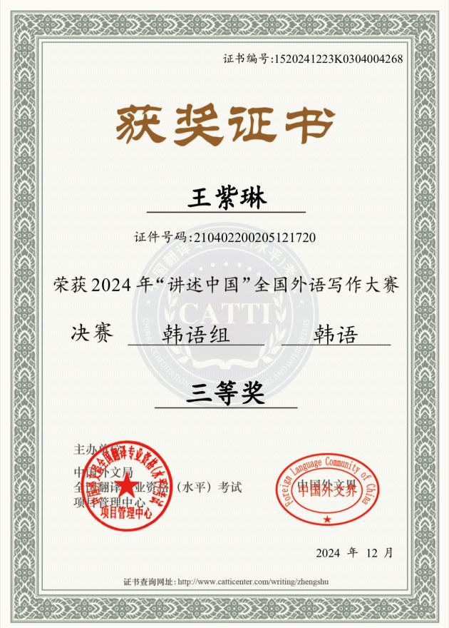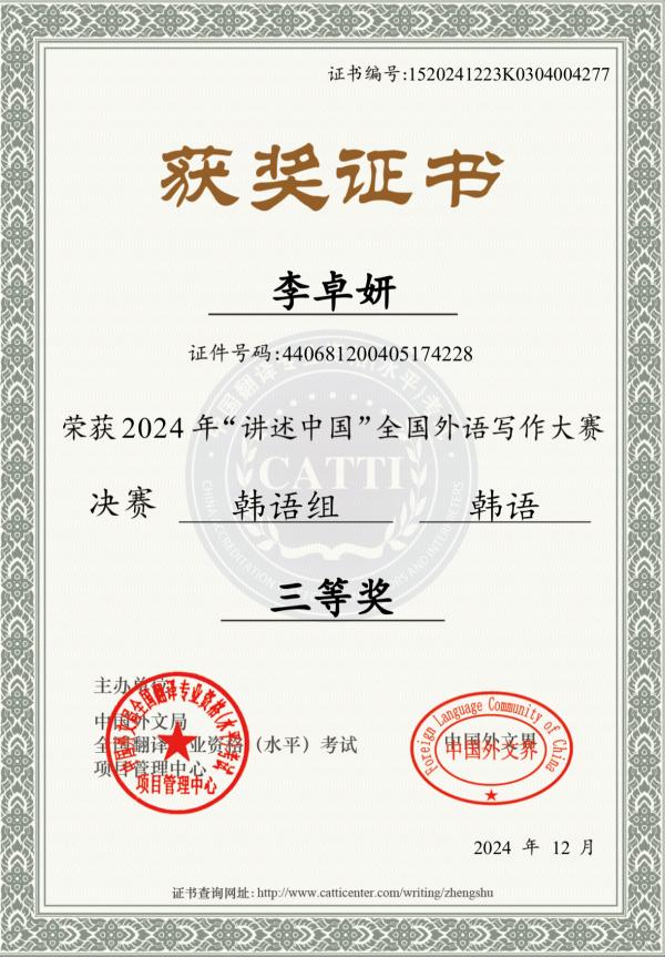 近日,2024年第三届“讲述中国”全国外语写作大赛决赛获奖名单揭晓。我校外国语学院朝鲜语专业全今花老师指导的2022级李卓妍、王紫琳同学分别荣获韩语组三等奖。