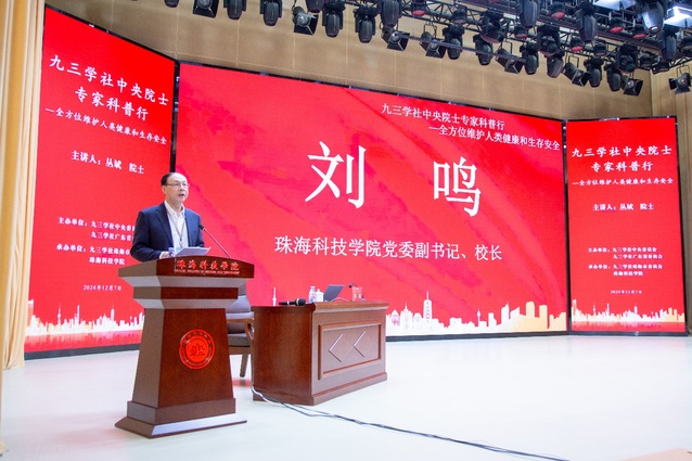 2024年12月7日,“九三学社中央院士专家科普行”活动在我校成功举办。全国人大常委会委员、宪法和法律委员会副主任委员,九三学社中央副主席、中国工程院院士丛斌以《全方位维护人类健康和生存安全》为题,为九三学社社员、珠海科技学院师生代表共百余人作专题讲座。九三学社中央社会服务部副部长蒋承华,九三学社中央委员、省委会专职副主委董美玲,中共珠海市委统战部常务副部长、一级调研员邹桦,珠海市政协副主席、九三学社珠海市委主委贺军,学校党委副书记、校长刘鸣,党委副书记王玉娟,党委专职副书记潘锋,党委委员、副校长程春梅等出席活动。