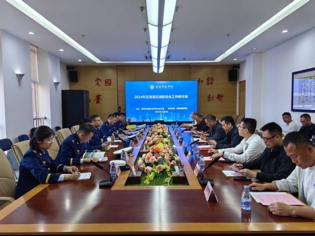 为进一步推动珠海各高校落实消防安全主体责任,强化学校的消防安全管理水平,12月4日,珠海市消防安全委员会办公室在我校召开2024年在珠高校消防安全工作研讨会。珠海市消防安全委员会办公室主任、珠海市消防救援支队支队长李汕,珠海市消防救援支队综合指导科科长黎宙、防火监督科科长黄凌霄、全媒体中心主任罗健棠,金湾区消防救援大队大队长黄展鸿出席会议,珠海市消防救援支队防火监督科、综合指导科、全媒体中心工作人员、珠海市各高校安全工作负责人参加会议,会议由珠海市消防救援支队副支队长刘拓主持。