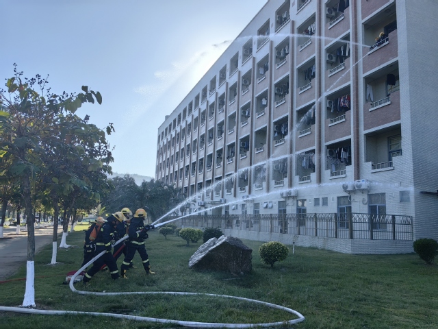 15时30分许,随着消防警笛声响起,模拟竹园八栋起火紧急逃生疏散演练正式开始。该楼某个宿舍因使用劣质充电设备引发火灾,宿舍内浓烟滚滚,且宿舍内有人被困,只见楼内其他学生弯腰捂鼻、迅速有序疏散到楼下安全区域。由于起火部位楼层较高,现场“火势”较大,消防队员们采用“加压水枪+消防水车+遥控水炮”的方式控制火势蔓延,同时另一组消防队员立即冲进起火宿舍,将一名晕倒的伤者抬下楼,同时交通运输部南通第一救助飞行队的救援直升机赶到旁边就近广场,对伤员进行索降救援和转运。整个演练过程,参演队伍反应迅速、配合默契,各个环节紧张有序,高效完成了本次演练任务,取得了良好的效果。