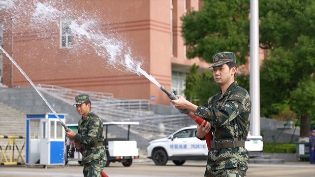 在“校园火情事件联动处置演练”中,学校一绿化带出现火情,学生机动特勤中队接报后迅速响应赶赴现场,熟练展开消防水带连接消防栓,手持水枪冲向“火源”方向,利用高压水柱有效地扑灭了火源。
