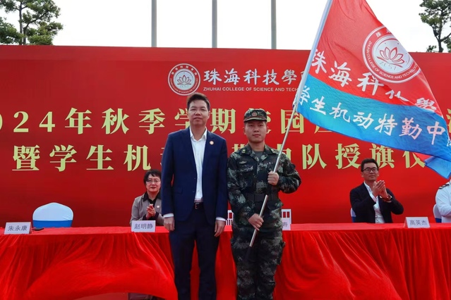 学生机动特勤中队是一支由在校退伍大学生组成的应急处突队伍,该队伍的成立旨在深入践行退伍学生“退伍不褪色”精神,广泛汇聚校园力量,筑牢校园治安防控网络,共同建设“平安校园”。为进一步加强学生机动特勤中队体系建设,打造一支“训练有素、服务专业、经验丰富、反应迅速”的队伍,演练结束后,举行学生机动特勤中队授旗仪式,仪式中,校党委委员、纪委书记、副校长黄学寿向中队长姜凯廷授予旗帜并合影留念,授旗仪式顺利完成。