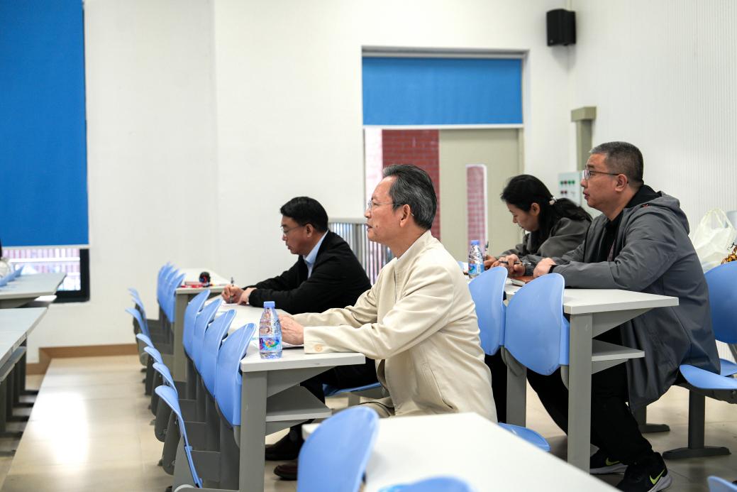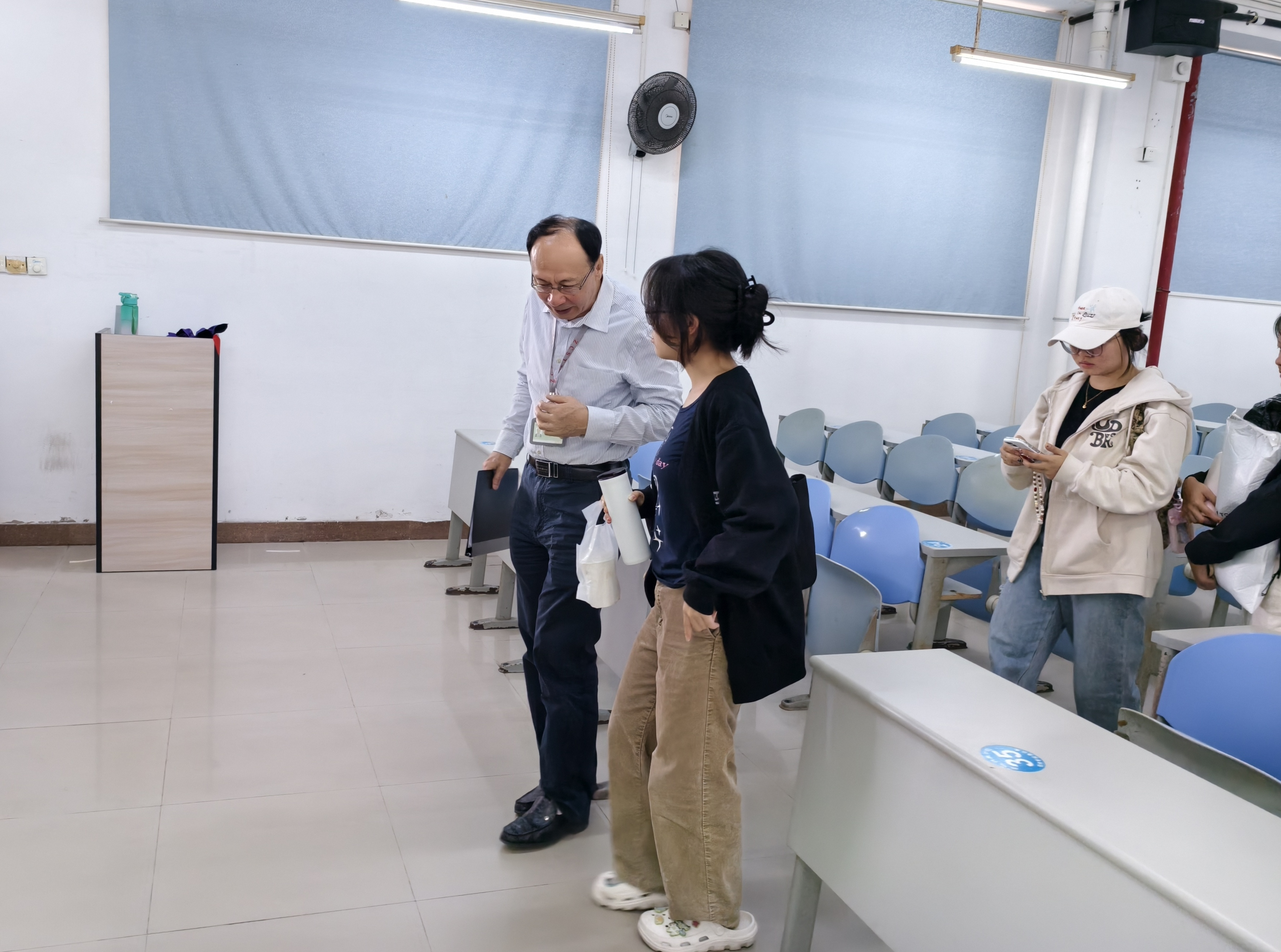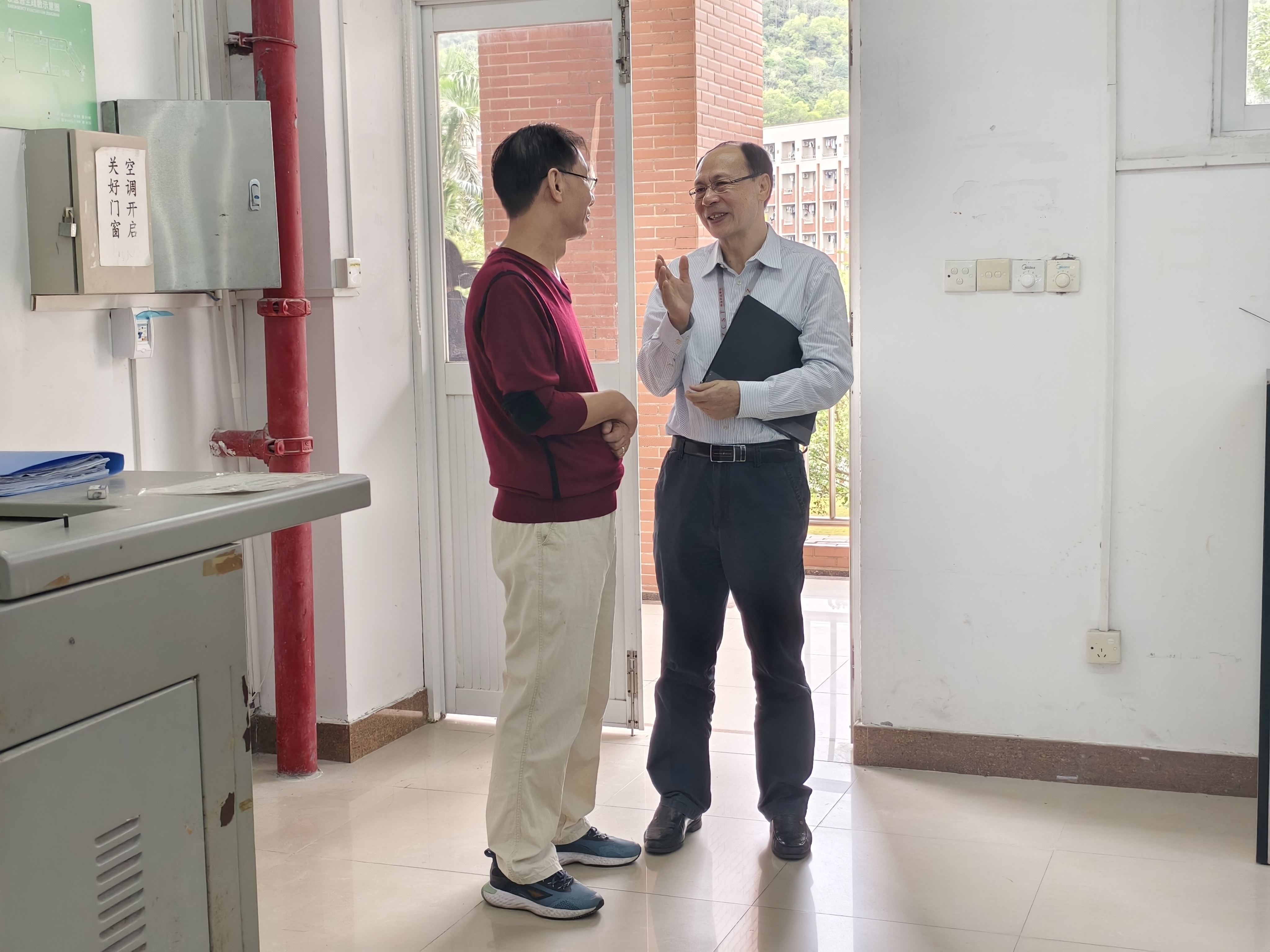 学校党委书记、理事长廖立国与授课教师杨振东交流