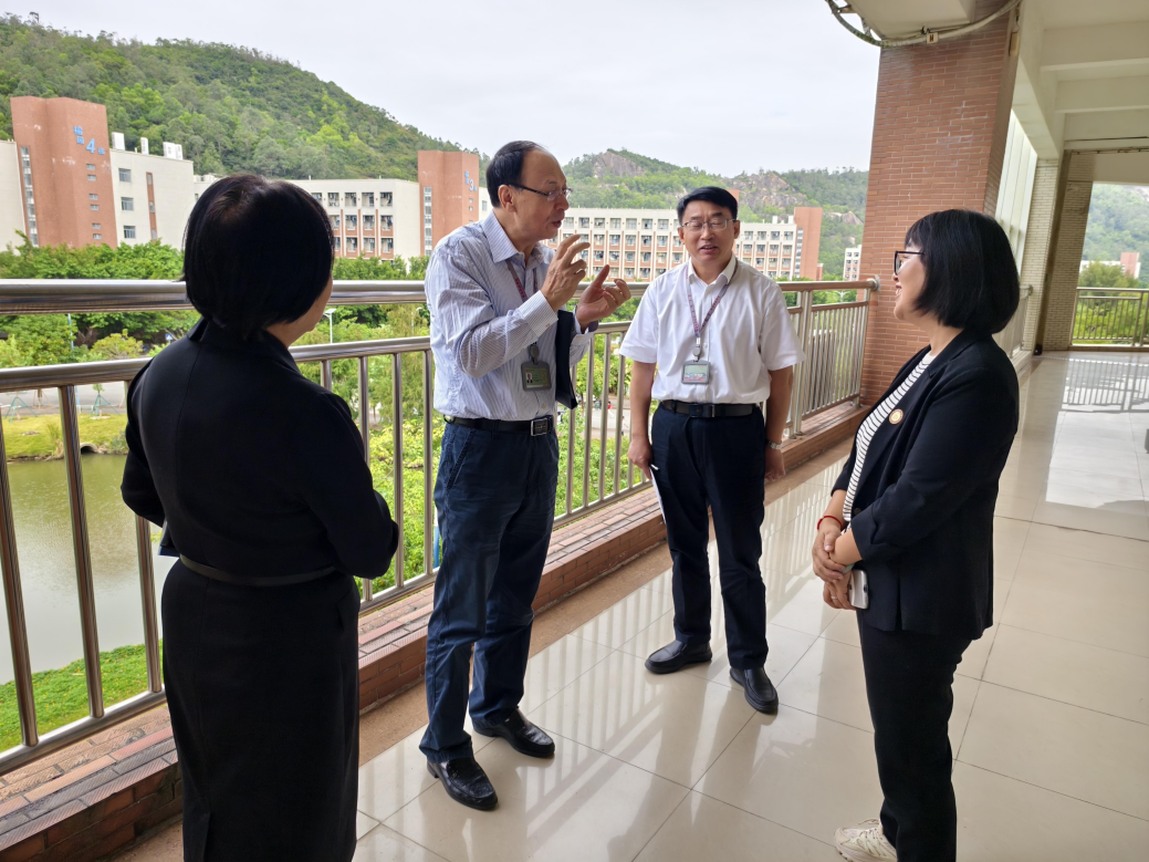 学校党委副书记、校长刘鸣与授课教师戴学英交流