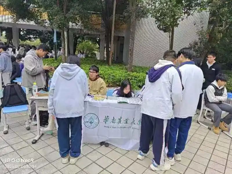 由于学校不允许进班宣讲,我们提前做好功课,另辟蹊径开展宣传工作。队员们借助校园广播、张贴海报等方式巧妙预热,提前勾起同学们的好奇心。活动当天,宣传队热情满满,以精巧的摊位布置、丰富的华农资料、有趣的互动环节,成功吸引众多高三学子驻足。大家一边分享华农特色,一边耐心答疑,充分展现了华农的魅力与实力,让同学们对华南农业大学充满向往。
