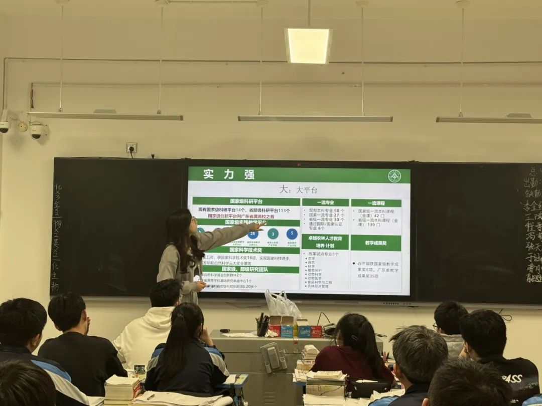 团队分别面向选科为物化生和史地政的两个班级进行了宣讲。通过PPT展示,他们向同学们详细介绍了华农的办学历史、办学优势、师资力量、特色专业及就业前景等内容,并结合物理类与历史类的专业报考情况进行了针对性分析。