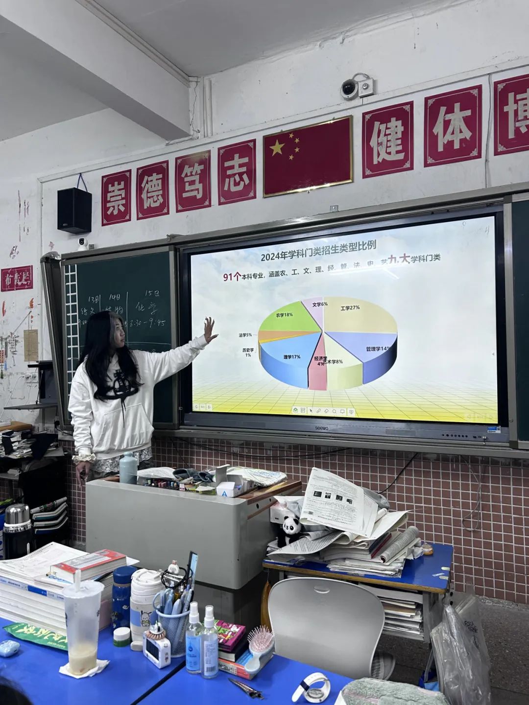 招生大使张居杨踏入高三的教室,开启进班宣讲。他从华农浓厚的学术氛围、丰硕的科研成果讲起,然后分享多样的社团生活以及独特的个人成长经历。精彩的内容、生动的讲述,点燃了学子们对华农的向往,为他们描绘出梦想与未来的美好蓝图。