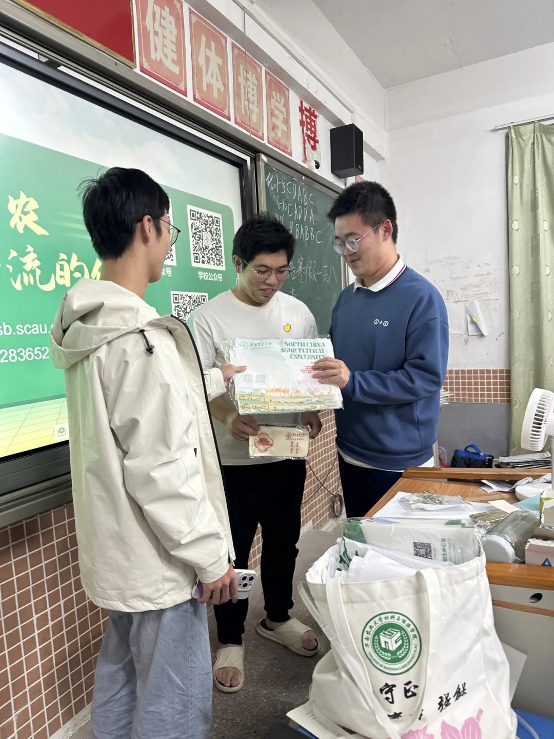 在宣讲开始前,团队将QQ咨询群号写在黑板上,并为同学们发放了华农的宣传册,以便同学们后续作进一步了解,也为活动的顺利开展奠定了基础。