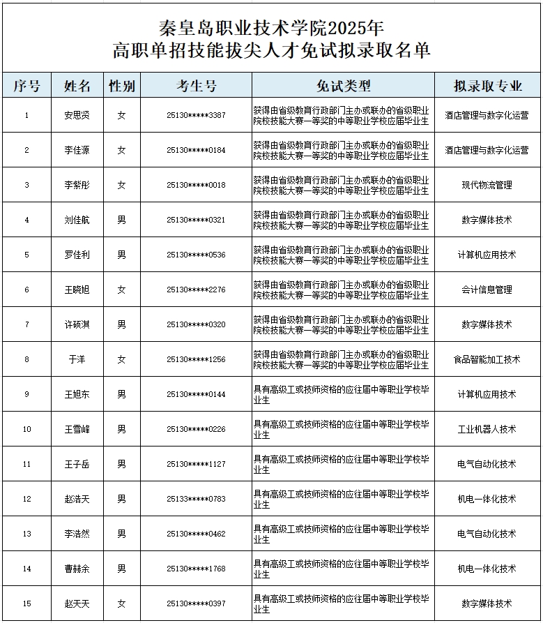依据《河北省教育厅关于做好2025年普通高等职业教育单独考试招生工作的通知》(冀教学[2024]11号)文件精神,经考生自主申请,专家认定,报学院单招工作领导小组审核,以下15名考生符合技能拔尖人才免试录取条件,现予以公示。 监督电话:0335-5926967、5926819