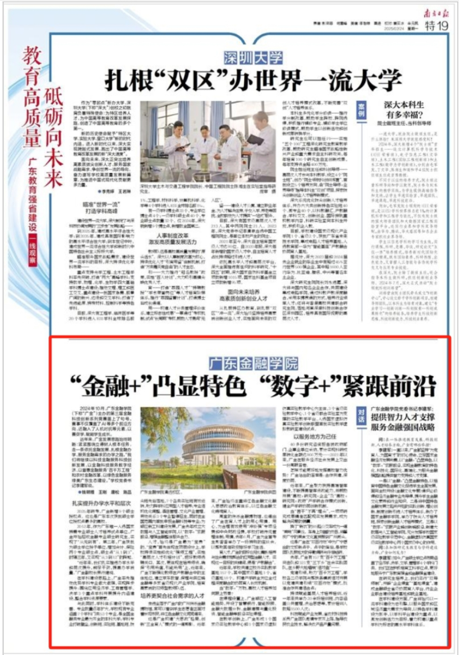 南方日报、南方+推出特刊《教育高质量 砥砺向未来》,刊发专版专访我校党委书记李建军《广东金融学院:“金融+”凸显特色 “数字+”紧跟前沿》。