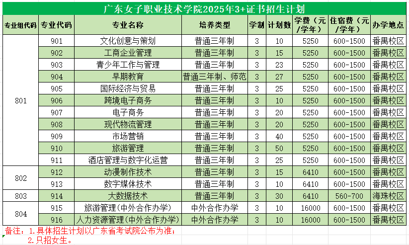 广东女子职业技术学院2025年春季高考3+证书招生计划