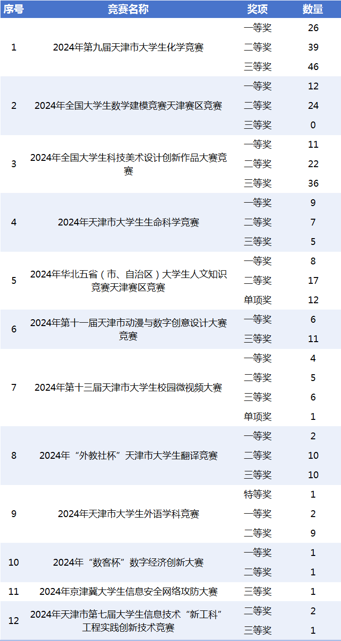 近日,天津市教委公布了2024年下半年全国大学生科技美术设计创新作品大赛等15项赛事的获奖名单。我校学子奋勇争先,成绩斐然,在2024年第九届天津市大学生化学竞赛、2024年全国大学生数学建模竞赛天津赛区竞赛、2024年华北五省(市、自治区)大学生人文知识竞赛天津赛区竞赛等多项高水平赛事中表现突出,累计斩获347项奖项,充分彰显了我校学子扎实的专业素养和卓越的创新能力。