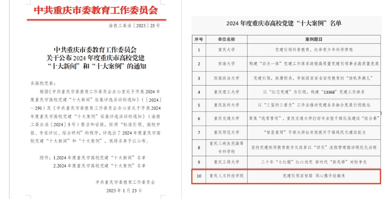 近日,重庆市委教育工作委员会办公室按照"标准引领、高校申报、专家评议、综合研判"的程序,评选出2024年度重庆市高校党建"十大案例"。我校党建案例《党建引领启智路 同心携手绘疆来》成功入选,是市内唯一一所入选"十大案例"名单的民办院校,标志着我校党建工作取得又一重要成果。