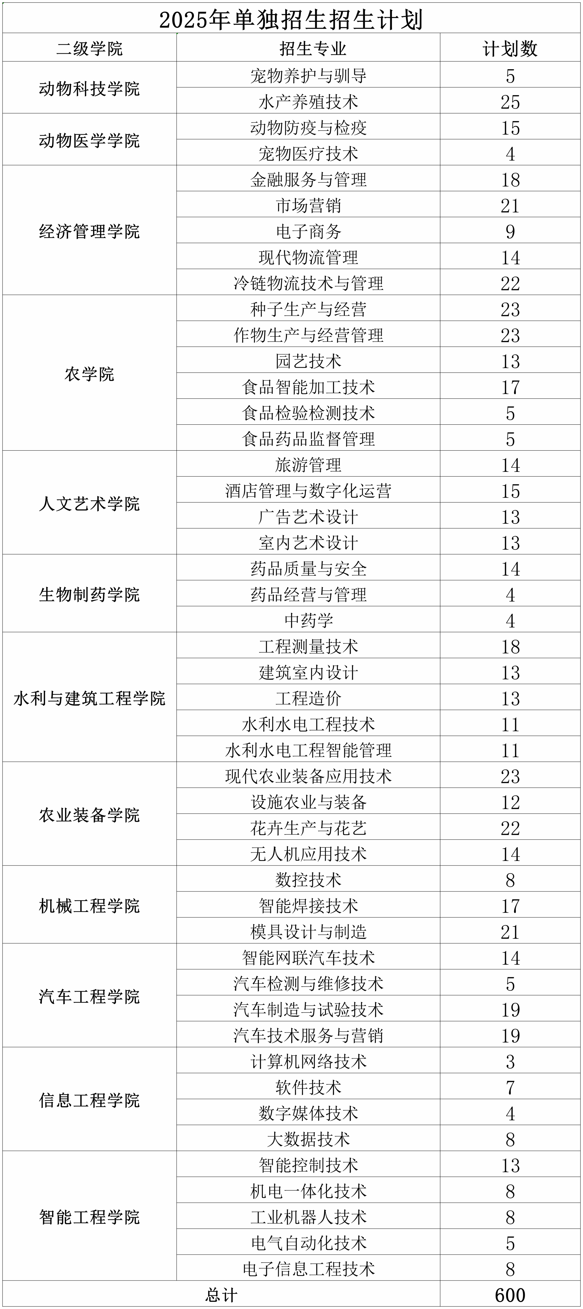 2025年单独招生计划