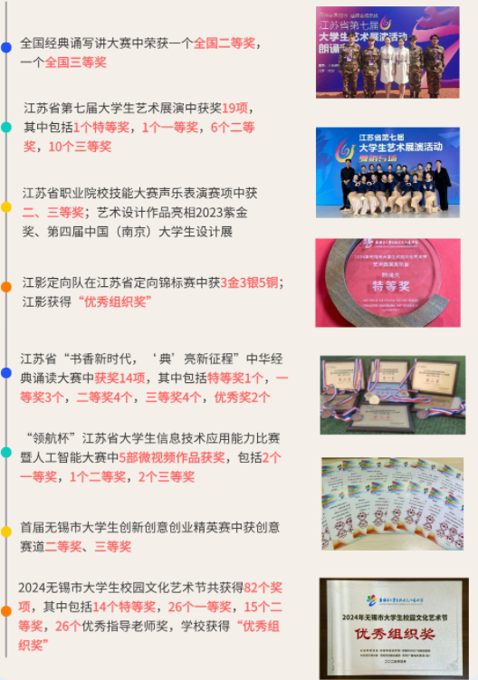 学校组建江苏省大学生合唱团、无锡市太湖传奇艺术团、惠山泥人艺术团、江苏省影视剧创作中心和各种社团组织,活跃在美丽的江影校园内外。
