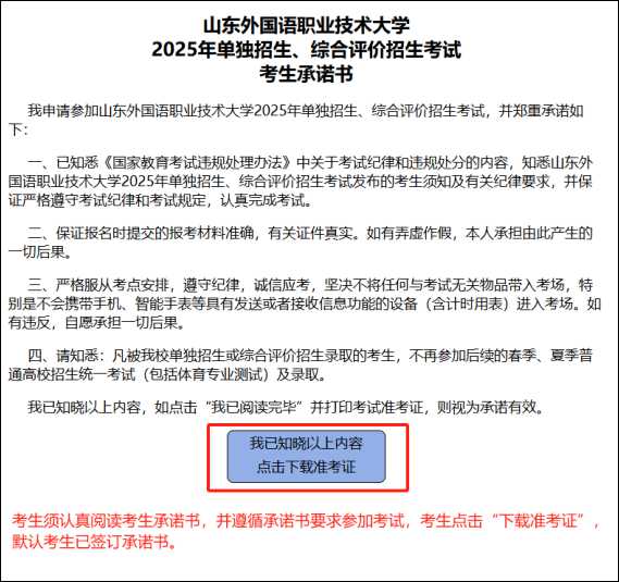 3.考生须认真阅读考生承诺书,并履行承诺书要求,“点击下载准考证”默认考生已签订考生承诺书。