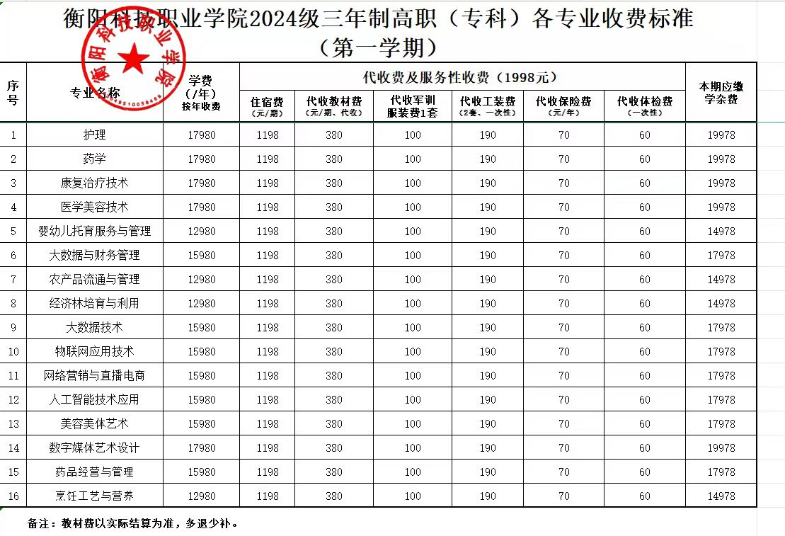 衡阳科技职业学院2024级三年制高职(专科)各专业收费标准(第一学期)
