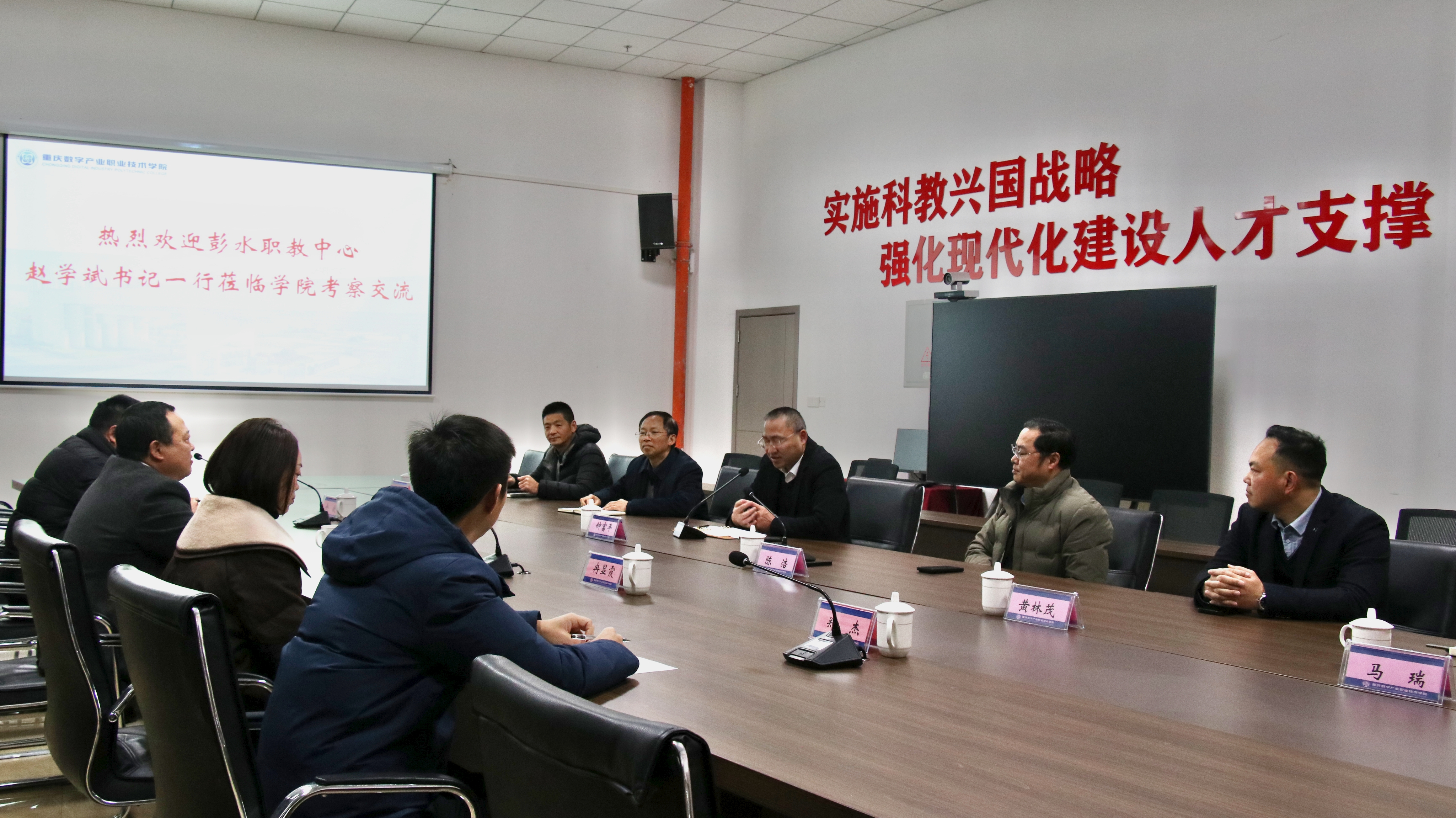2月26日上午,彭水自治县职业教育中心党委书记赵学斌带领高考部、后勤科和招投标中心负责人专程到学院考察交流,共同探讨职业教育未来的发展愿景。学院党委书记钟富平致欢迎辞,执行院长陈浩介绍学院发展情况。副院长刘长志主持。