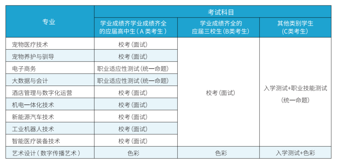 (2)普通专业参加统一命题的职业适应性测试,其测试办法:文化基础150分、职业与心智90分、专业通识基础60分,总分值300分。其中宠物医疗技术、宠物养护与驯导、机电一体化技术、新能源汽车技术、工业机器人技术、酒店管理与数字化运营、智能医疗装备技术参加由学校组织的校考面试,满分为300分.