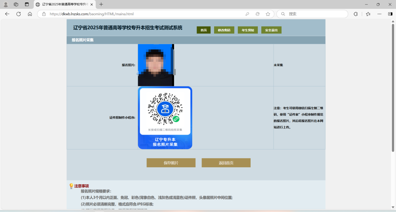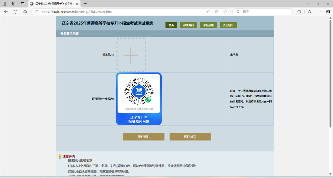 11.返回首页后,点击“报名照片”,进入报名照片采集界面,按照系统要求上传本人近期正面免冠彩色证件照片