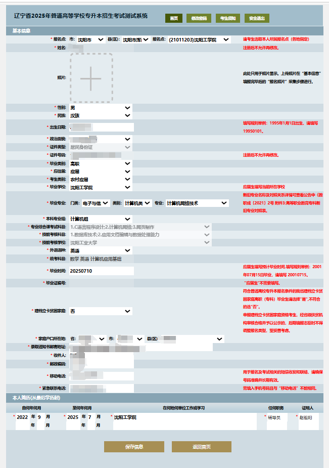 9.在基本信息填报界面中,填报地点分别选择“沈阳市”,“沈阳市浑南区”“沈阳工学院”,信息检查无误后,点击保存信息。