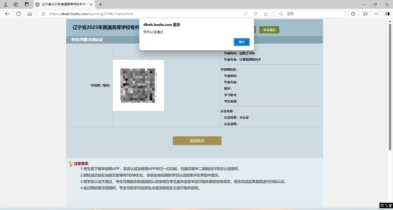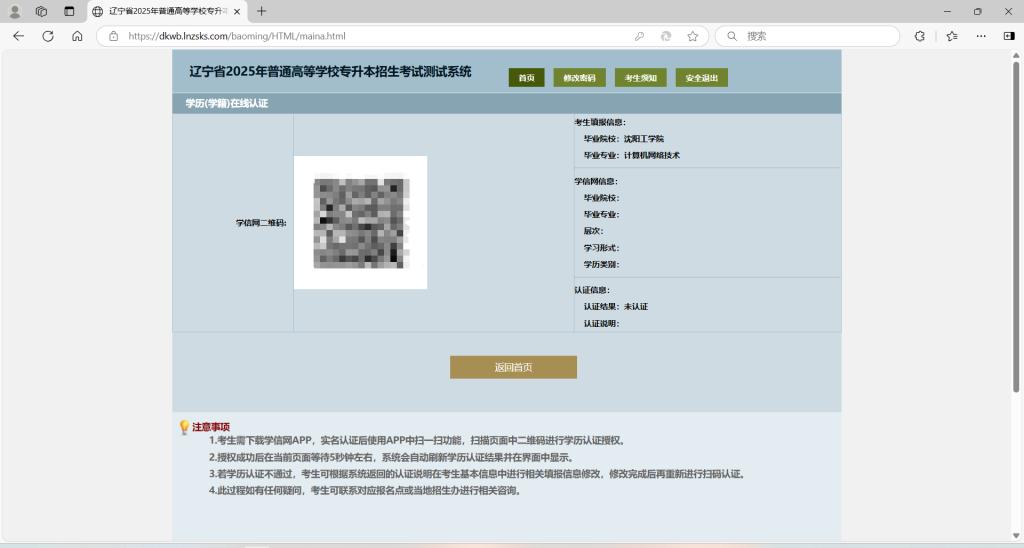 10.基本信息填表完毕后,点击“返回首页”后,点击“学历(学籍)认证”按钮进入学历(学籍)认证界面,使用学信网APP进行扫码授权认证。