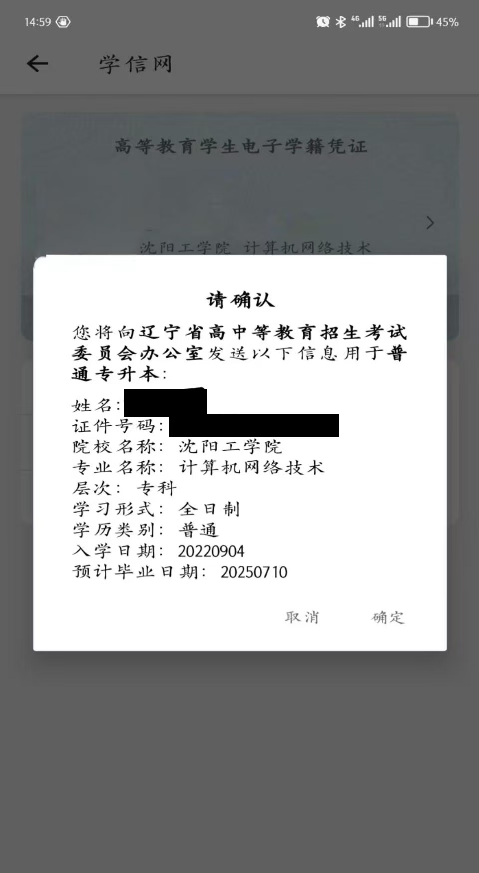 在学信网APP扫码后,手机上学信网APP会进行真人核验,完成后,学信网APP上会显示个人信息,确定无误后,点击“确定”,注:此步骤在手机端学信网APP完成
