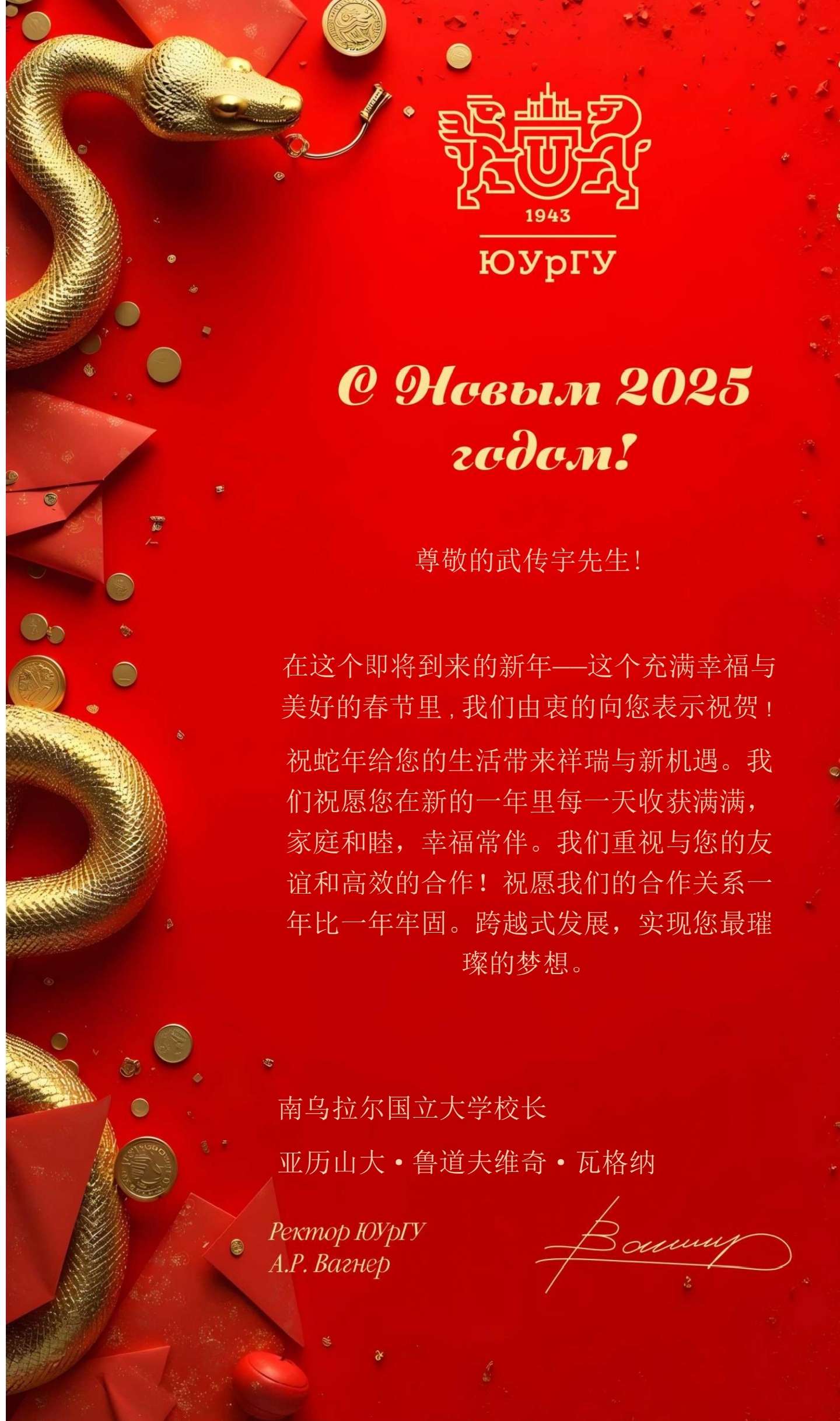 俄罗斯南乌拉尔国立大学校长亚历山大·鲁道夫维奇·瓦格纳在贺信中送上新春祝福,愿在新的一年里两校合作更加牢固,实现“最璀璨的梦想”。贺信中特别提到,双方的高效合作与深厚友谊是共同发展的基石,期待未来在科研、教育领域携手推进跨越式发展,为全球高等教育事业注入新活力。