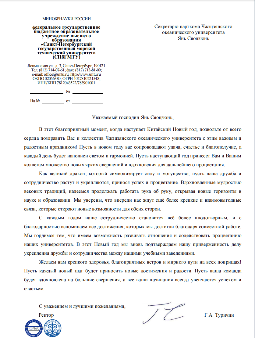 2025年农历蛇年新春之际,浙江海洋大学收到来自俄罗斯圣彼得堡国立海洋技术大学、俄罗斯南乌拉尔国立大学、泰国进步学院的新年贺信。三所海外合作院校向浙江海洋大学党委书记、校长及全体师生致以诚挚的新春祝福,高度肯定双方合作成果,并表达深化未来教育科研合作的殷切期望。