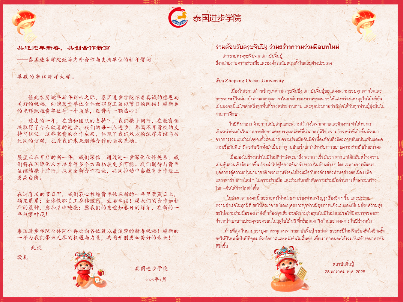 泰国进步学院在新年贺信指出,过去一年双方在教育合作中取得显著进展,国际化人才培养成果令人欣喜,如成功举办了泰国研学夏令营、汉语教师培训、全泰中国语言文化大赛等。期待未来两校进一步加强协作,拓展中泰教育合作新领域,共同推动“如新春晨钟般清晰嘹亮”的合作愿景落地生根。携手同行,共赴未来