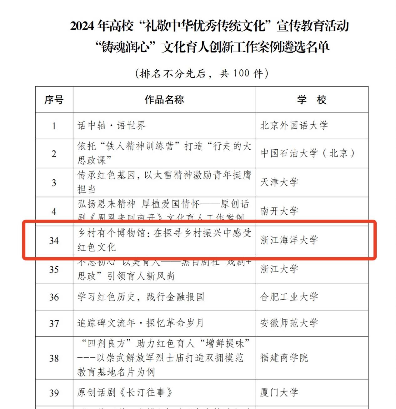 近日,教育部公布了2024年高校“礼敬中华优秀传统文化”宣传教育活动结果,由浙江海洋大学党委宣传部选送的作品《乡村有个博物馆:在探寻乡村振兴中感受红色文化》获评2024年高校“礼敬中华优秀传统文化”宣传教育活动“铸魂润心”文化育人创新工作案例。这是学校连续2年入选教育部“礼敬中华优秀传统文化”宣传教育活动。2024年该类别全国共100所高校获评,全省仅浙江大学、浙江海洋大学2所高校入选。