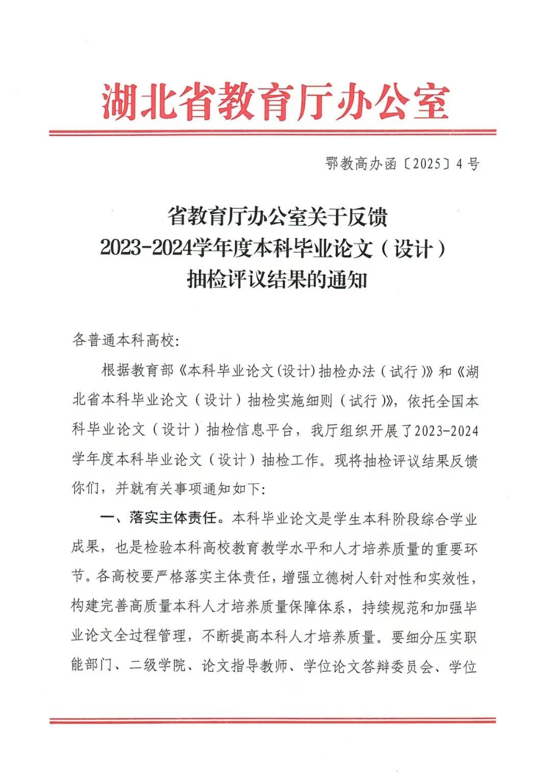 本网讯(通讯员 王津)近日,湖北省教育厅公布了2023-2024学年度本科毕业论文(设计)抽检评议结果,我校在此次抽检中表现突出,被抽检的72篇本科毕业论文(设计)全部合格,合格率达到100%,在全省同类高校中位居前列。