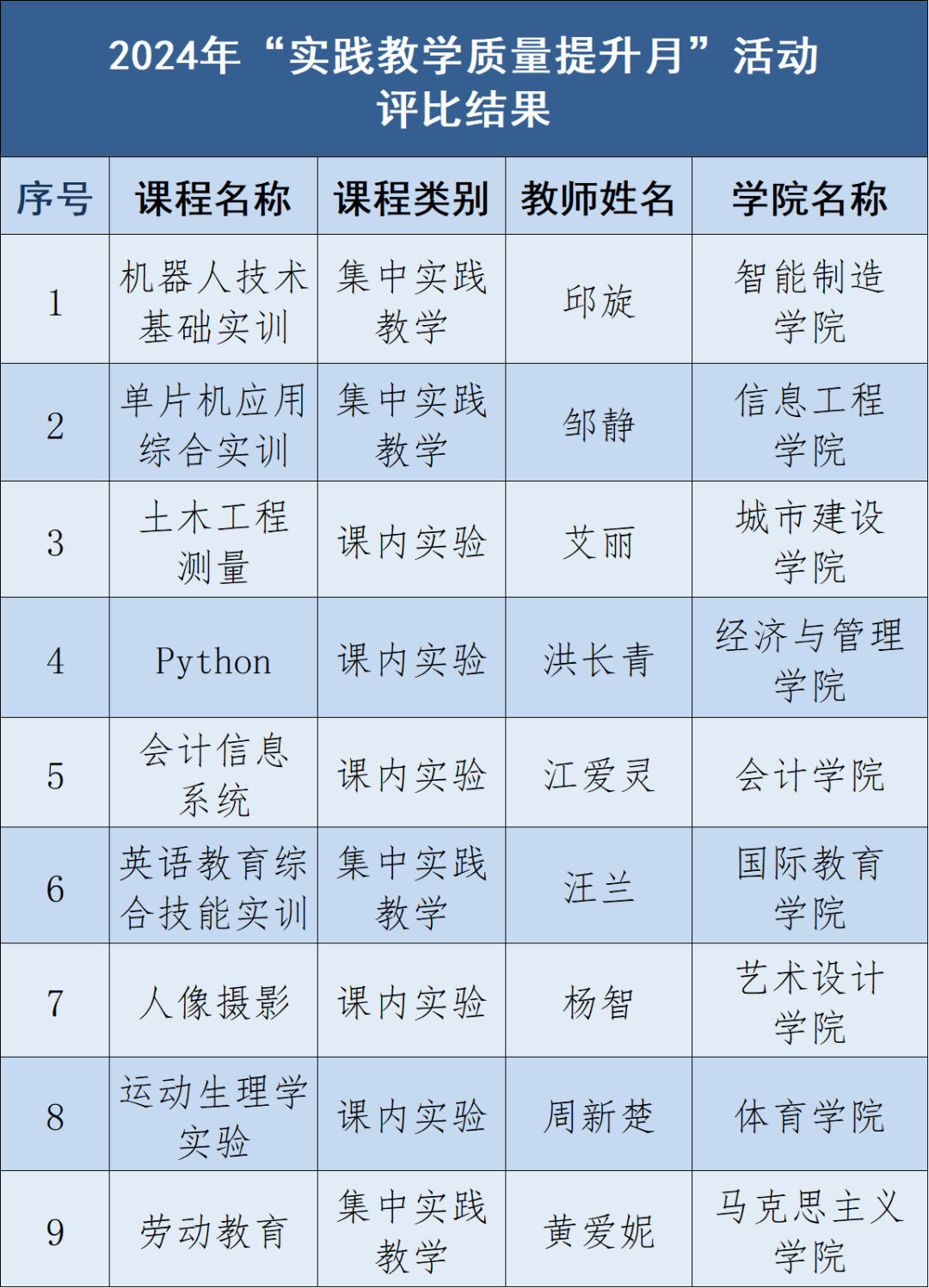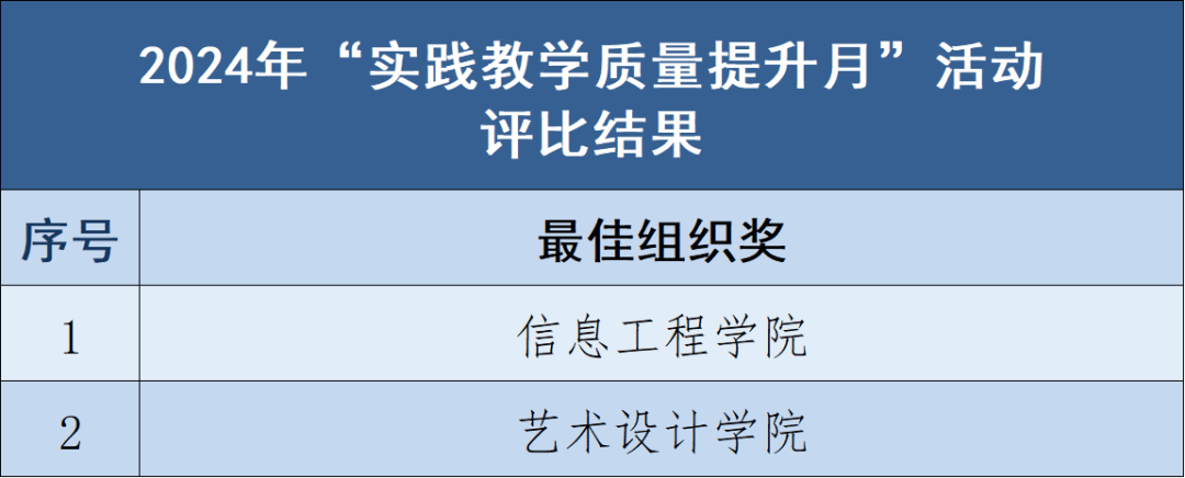 评比活动自2024年11月开展以来,各学院高度重视,积极组织,高质量完成了实践教学专题研讨、教学观摩与实践课程分析、实践教学专项检查和听课巡课评课活动。经学校专家组评审,智能制造学院《机器人技术基础实训》、信息工程学院《单片机应用综合实训》、城市建设学院《土木工程测量》等9门课程成功获评为优秀实践课堂;信息工程学院和艺术设计学院荣获最佳组织奖。