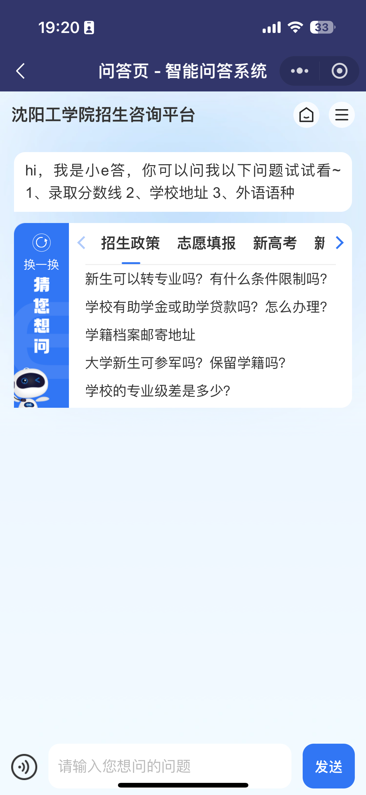 进入“【沈工招办】”小程序主页面,点击“智能机器人小E”,跳转至问答页即可进行提问。