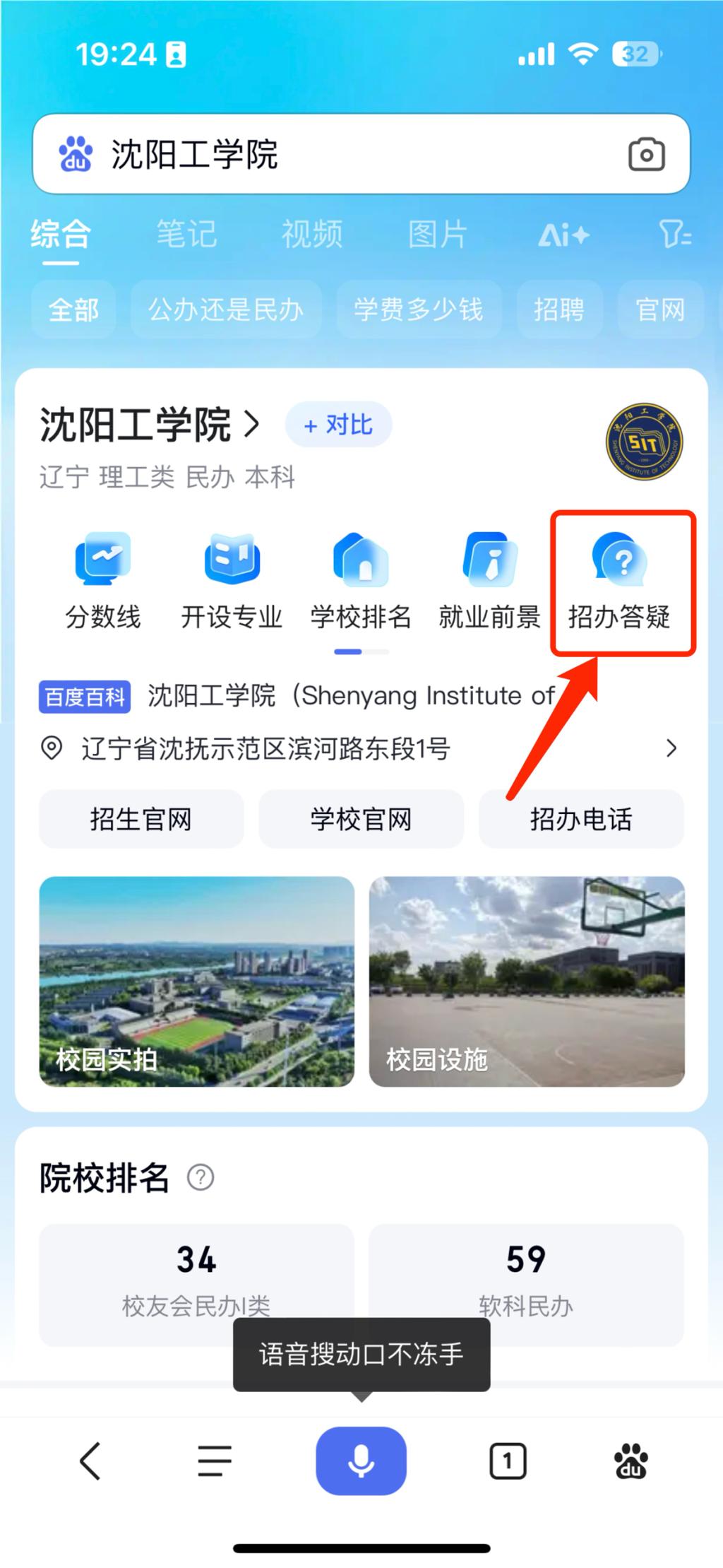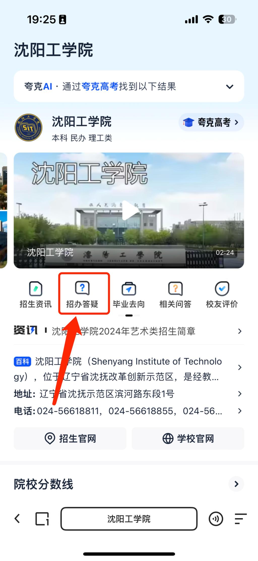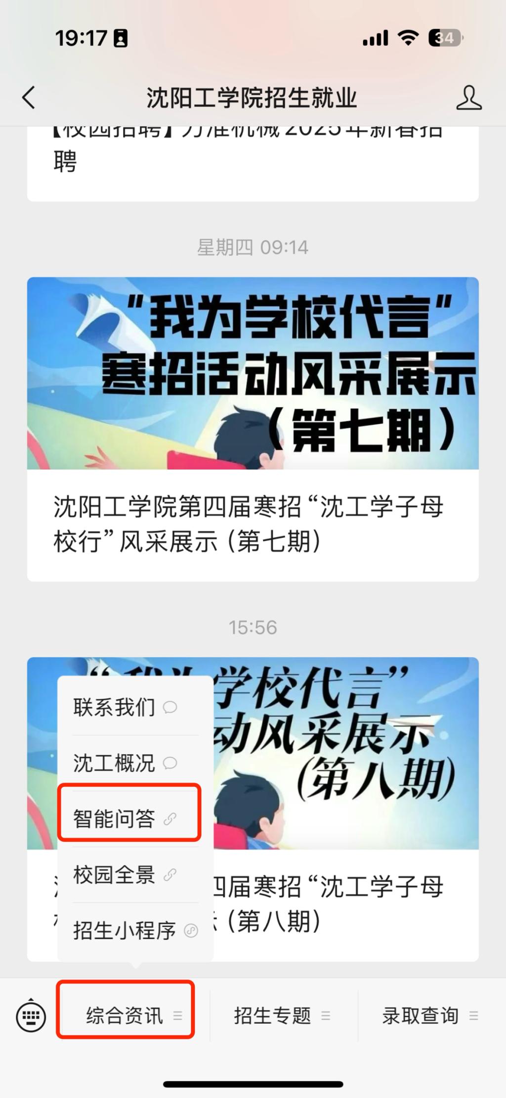 关注“【沈阳工学院招生就业】”微信公众号,进入主页,点击底栏“信息查询”菜单栏的“常见问题”即可在线咨询。移动端招生咨询平台问答页同时支持语音提问。