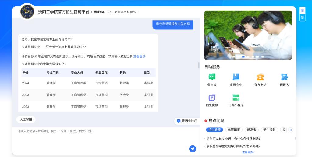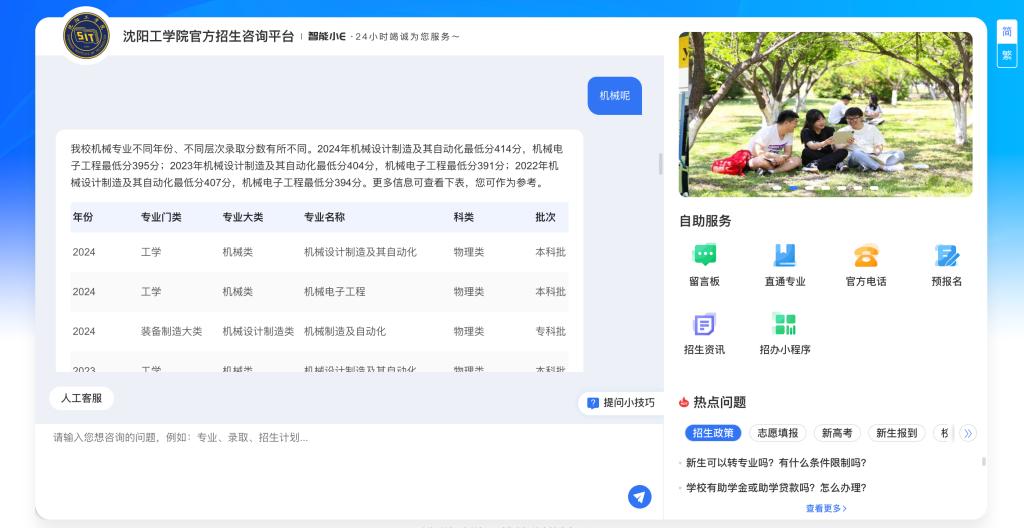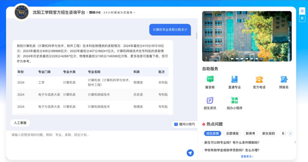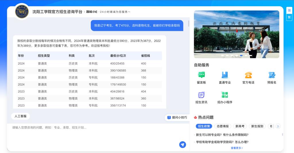 当你问“我是辽宁考生,今年考了470分,选科是物化生,能被你们学校录取吗”时,系统不仅能通过DeepSeek大模型技术精准识别你的咨询意图是:省份、分数、选科要求、录取分数,还会结合历年录取数据,为你提供精准的回复!