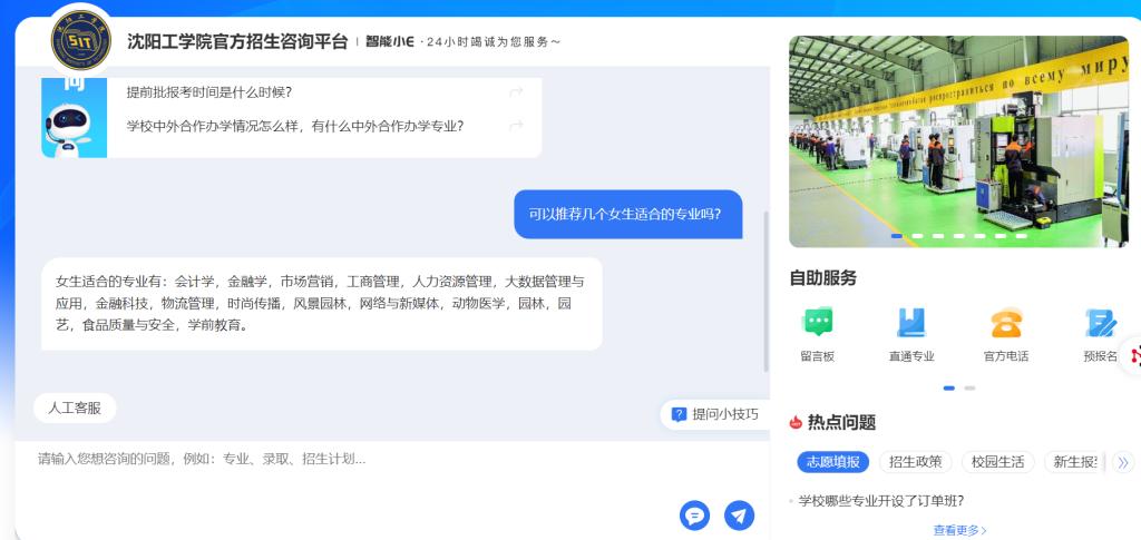 登录【沈阳工学院】招生官网(网址:https://zsxx.situ.edu.cn/ ),点击右侧“智能机器人小E”,在登录界面完善基础信息后即可在线咨询或留言。(操作详情见下图)