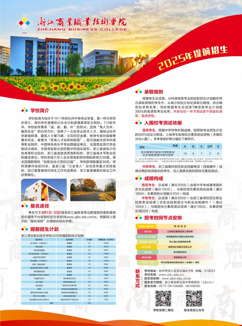浙江商业职业技术学院2025年高职提前招生计划525名,其中面向普通类招生计划330名,面向单独考试招生计划195名。2025年招生专业、普高生学考折算分值标准有所调整,请考生们留意相关变化。