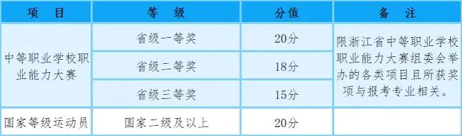 以上赋分为个人项目,其他所有团体项目成员按个人项目分值的50%计分。考生不同类奖项可累计赋分,但赋分最高分值累计不超过20分;取得证书时间为我校提交佐证材料截止日期前。素质特长项目赋分需经相关部门认定,学校招生领导小组审核后有效。