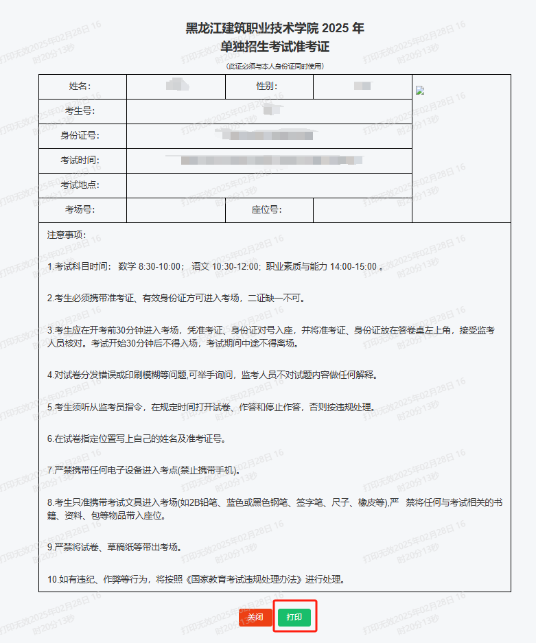 六、系统点击“准考证”弹出准考证页面,点击“打印”即可完成。打印时请注意张方向设置,使准考证打印在一张纸上。