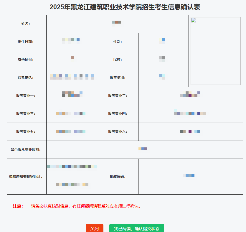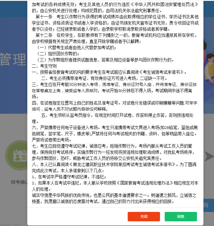 四、点击“报考确认”,阅读《黑龙江建筑职业技术学院2025年单独招生考试考生诚信考试承诺书》点击“同意”。核对报考信息,确认无误点击“我已阅读,确认提交状态”。