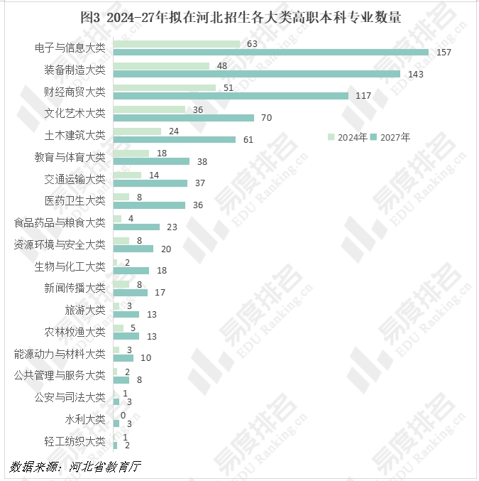 2027年拟在河北招生的高职本科专业达到789个,相比2024年各大类招生专业数量均增加。其中