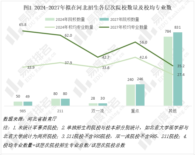 2027年起拟在河北招生的院校达到1236所,相比2024年增加了54所。其中985、211、双一流层次高校数量基本无变化,重点层次院校增加6所,其他院校增加47所,其他院校为主要增长点,增幅接近6%。