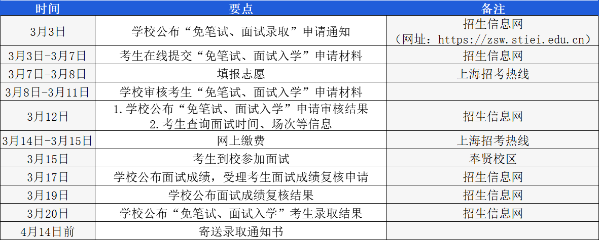 1.申请“免笔试、面试入学”的考生,仍需于3月7日、8日规定时间内在上海招考热线完成志愿填报;并于3月14日、15日规定时间内在上海招考热线完成缴费,否则取消录取资格。