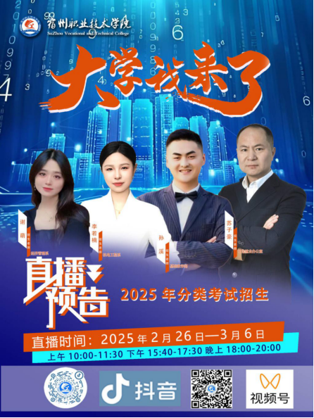 为帮助广大考生及家长更好地了解我院的办学特色、专业设置及招生政策,学院于2025年2月26日开启招生直播。本轮直播将通过抖音、微信视频号等平台进行,邀请学院招生办工作人员、各院系优秀教师参加,全方位、多角度展示学院风采,解答考生及家长的疑问。