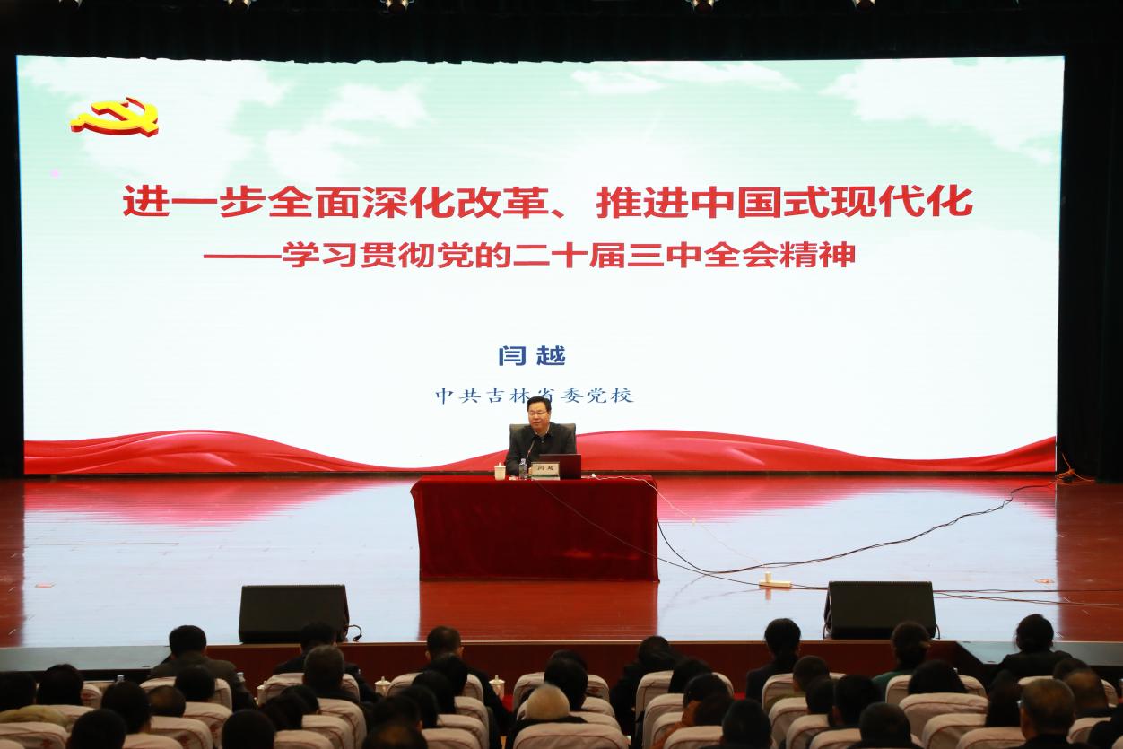 吉林省委党校一级巡视员、首席专家闫越教授为培训班作首讲,题为《进一步全面深化改革、推进中国式现代化》。报告围绕党的二十届三中全会的重大意义与总体要求、积极发挥经济体制改革牵引作用、注重全面改革统揽改革发展全局、提高党对进一步全面深化改革的领导水平四个方面,紧密结合习近平总书记在听取吉林省委和省政府工作汇报时的重要讲话精神,作了深入浅出的阐释,既有深刻的理论分析,也有贴近实际的典型事例,全校干部提升了思想认识和理论素养。