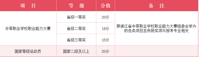 以上赋分为个人项目,其他所有团体项目成员按个人项目分值的50%计分。考生不同类奖项可累计赋分,但赋分最高分值累计不超过20分;取得证书时间为我校提交佐证材料截止日期前。素质特长项目赋分需经相关部门认定,学校招生领导小组审核后有效。