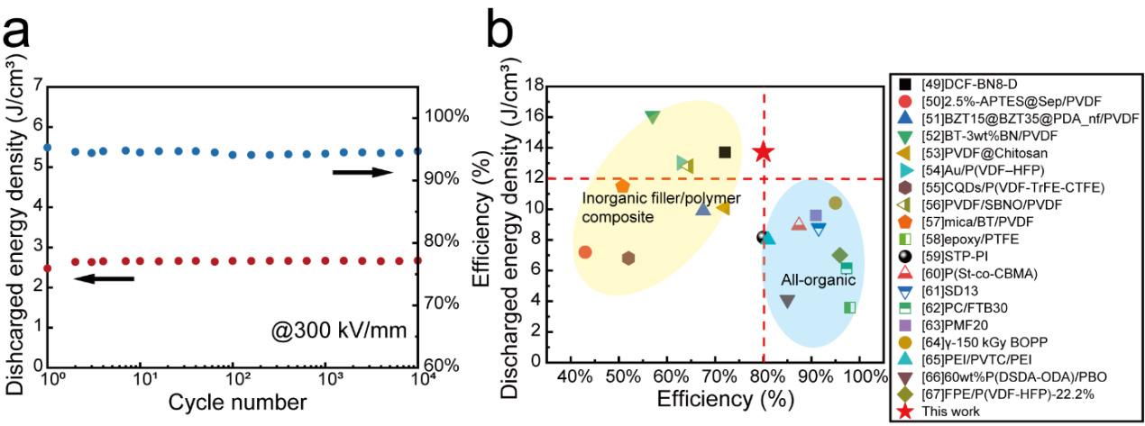 图2.全有机复合电介质薄膜的循环稳定性与性能对比