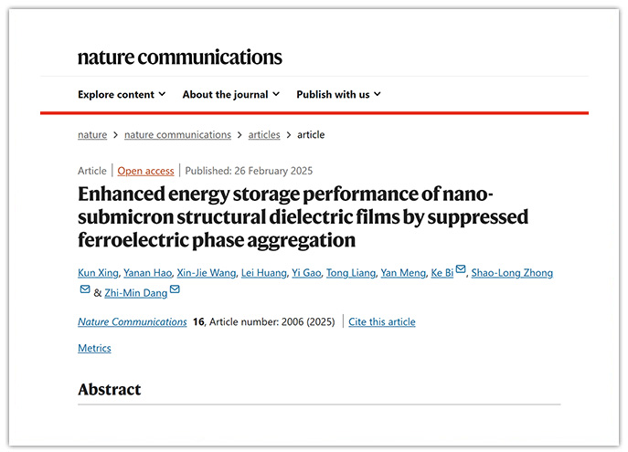 2月27日,Nature子刊《Nature Communications》在2025年第16卷发表题目为“Enhanced energy storage performance of nano-submicron structural dielectric films by suppressed ferroelectric phase aggregation(通过抑制铁电相聚集提高纳米-亚微米结构电介质薄膜的储能性能)”的学术论文。